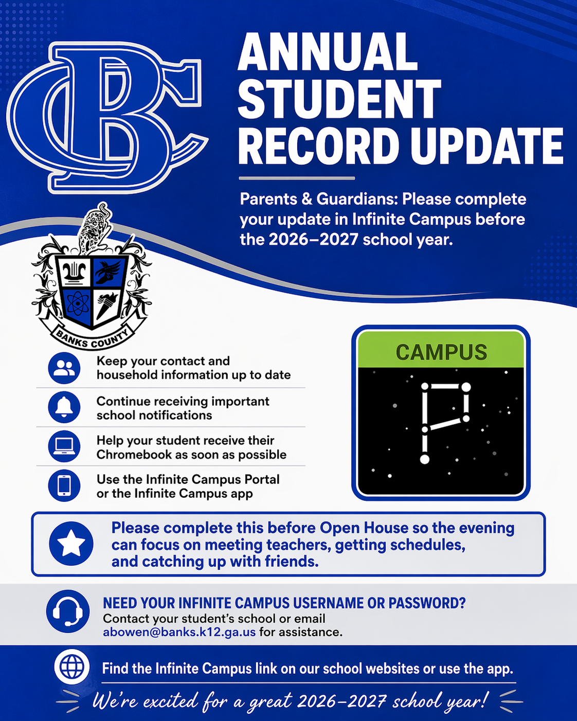 This important update helps ensure that your family’s contact and household information is accurate and up to date. It also allows you to continue receiving important school notifications and helps your student receive their Chromebook as soon as possible for the new school year.